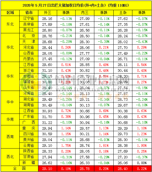 2020年5月27日,中国主流市场出栏外三元、内三元及土杂商品大猪综合日均价上涨,全国生猪出栏综合日均价28.92元每公斤,相比昨天上涨0.20%。