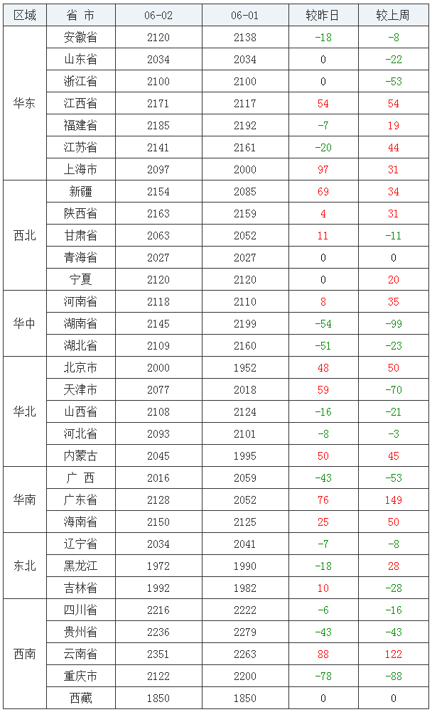 玉米均价(饲料原料)前十:云南省2351元/吨、贵州省2236元/吨、四川省2216元/吨、福建省2185元/吨、江西省2171元/吨、陕西省2163元/吨、新疆维吾尔自治区2154元/吨、海南省2150元/吨、湖南省2145元/吨、江苏省2141元/吨;