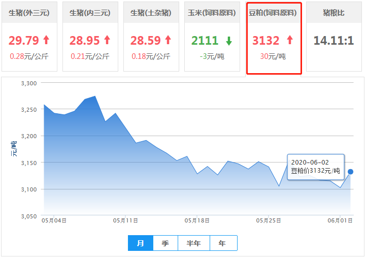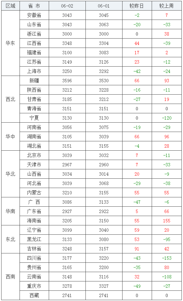 豆粕均价(饲料原料)前十:新疆维吾尔自治区3596元/吨、江西省3348元/吨、重庆市3278元/吨、上海市3250元/吨、吉林省3248元/吨、陕西省3212元/吨、内蒙古自治区3210元/吨、海南省3205元/吨、甘肃省3185元/吨、四川省3177元/吨;