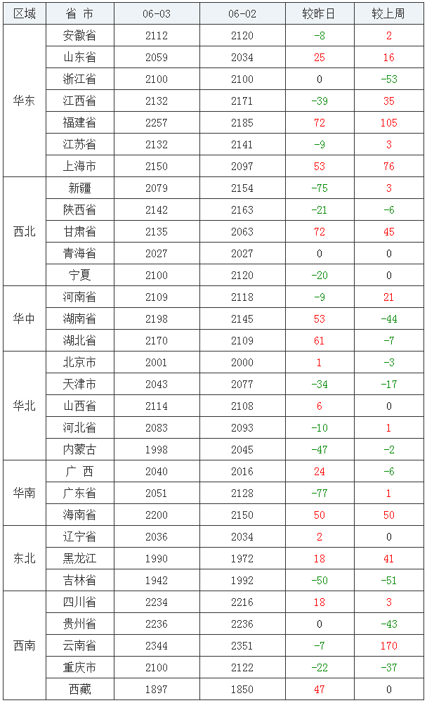 玉米均价(饲料原料)前十:云南省2344元/吨、福建省2257元/吨、贵州省2236元/吨、四川省2234元/吨、海南省2200元/吨、湖南省2198元/吨、湖北省2170元/吨、上海市2150元/吨、陕西省2142元/吨、甘肃省2135元/吨;