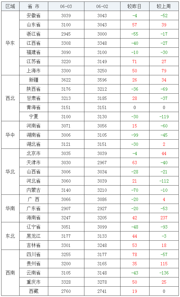 豆粕均价(饲料原料)后十:西藏自治区2760元/吨、广东省2907元/吨、浙江省2945元/吨、山西省3006元/吨、湖南省3006元/吨、天津市3030元/吨、北京市3035元/吨、安徽省3039元/吨、辽宁省3051元/吨、河北省3060元/吨。