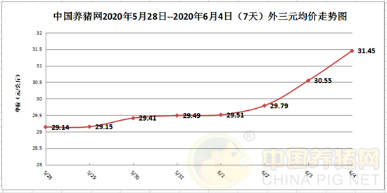 2020年6月4日(星期四),据中国养猪网猪价系统监测全国外三元均价为31.45元/公斤,猪价较昨日上涨0.90元/公斤,较上周上涨2.31元/公斤。进入六月,猪价涨幅仿佛又增加了一个度,特别是近两日猪价更是一个“质”的飞跃。