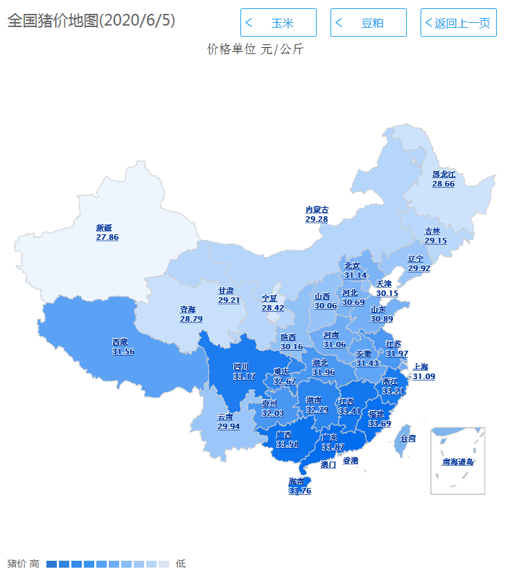 今日猪价下跌最高地区为:山西省,外三元均价为30.06元/公斤,较昨日下跌0.25元/公斤。