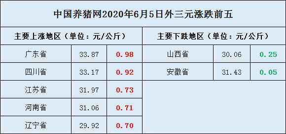 今日猪价上涨最高地区为:广东省,外三元均价为33.87元/公斤,较昨日上涨0.98元/公斤。
