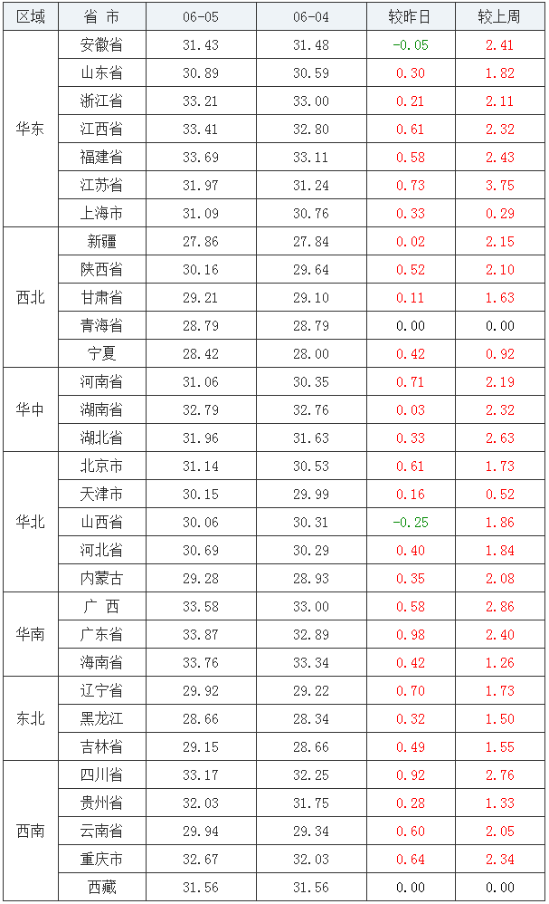 从“全国外三元均价涨跌表”来看,今日我国多地猪价涨势较昨日趋缓,其中表现之一是暴涨省份涨势整体较昨日有所减缓;其二是猪价大涨省份数量较昨日有所减少;其三是我国今日各地猪市出现猪价下跌省份,虽说跌势均较小,但猪价“飘绿”的事实不可改变!
