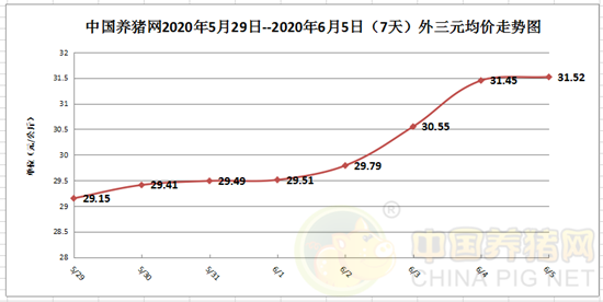 从“中国养猪网2020年05月29日-6月5日(7天)外三元均价走势图”来看,今日猪价“情绪”看来已经稳定,没了前几日的“暴躁”,显得稳重起来。