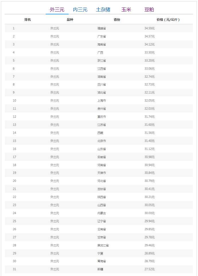 从“全国猪价排行榜”来看,今日我国猪价榜首再度“换人”,华南3省猪价水平在全国分别占领2-4名的位置,猪价排名首位的是福建省。