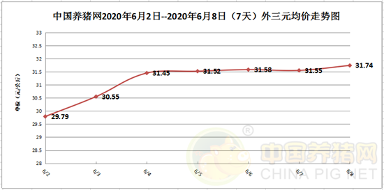 2020年6月8日(星期一),据中国养猪网猪价系统监测全国外三元均价为31.74元/公斤,猪价较昨日上涨0.19元/公斤,较上周上涨2.23元/公斤。上周猪价也依然持续着上涨趋势,但在周末有些许“徘徊”,但在徘徊之后似乎又坚定了“自己”的上涨想法。