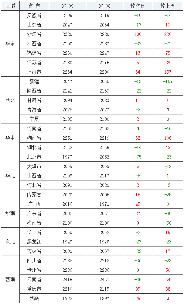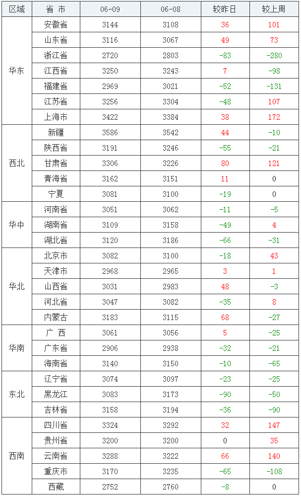 豆粕均价(饲料原料)后十:浙江省2720元/吨、西藏自治区2752元/吨、广东省2906元/吨、天津市2968元/吨、福建省2969元/吨、山西省3031元/吨、河北省3047元/吨、河南省3051元/吨、广西壮族自治区3061元/吨、辽宁省3074元/吨。