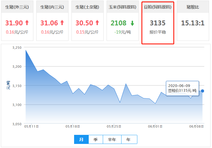 豆粕均价(饲料原料)前十:新疆维吾尔自治区3586元/吨、上海市3422元/吨、四川省3324元/吨、甘肃省3306元/吨、云南省3288元/吨、江苏省3256元/吨、江西省3250元/吨、贵州省3200元/吨、陕西省3191元/吨、内蒙古自治区3183元/吨;