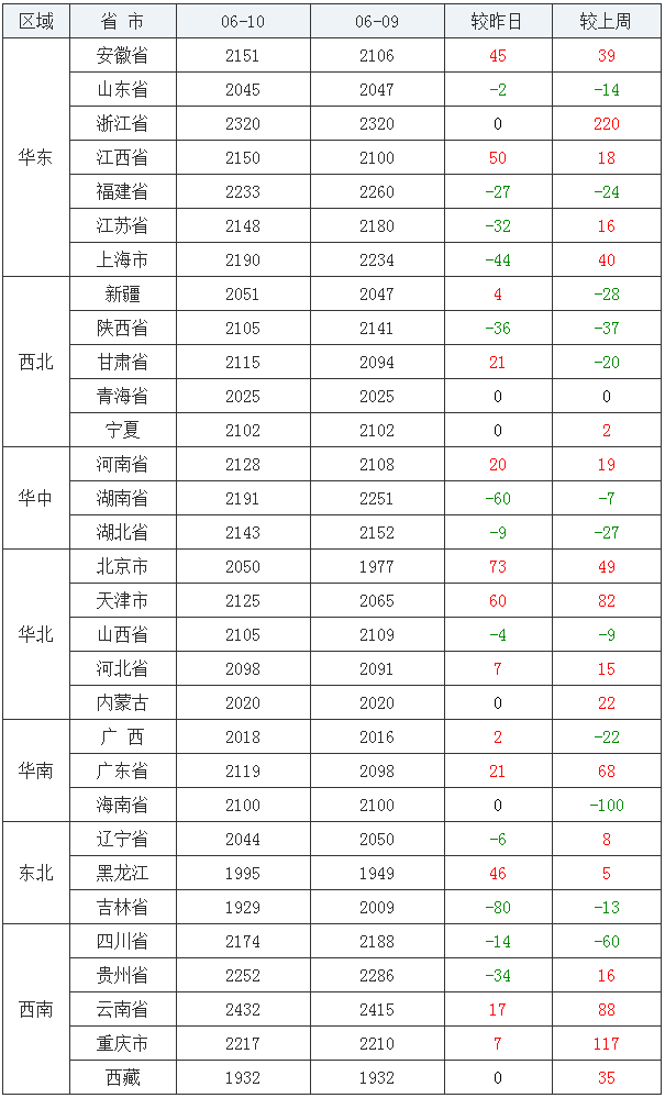 玉米均价(饲料原料)前十:云南省2432元/吨、浙江省2320元/吨、贵州省2252元/吨、福建省2233元/吨、重庆市2217元/吨、湖南省2191元/吨、上海市2190元/吨、四川省2174元/吨、安徽省2151元/吨、江西省2150元/吨;