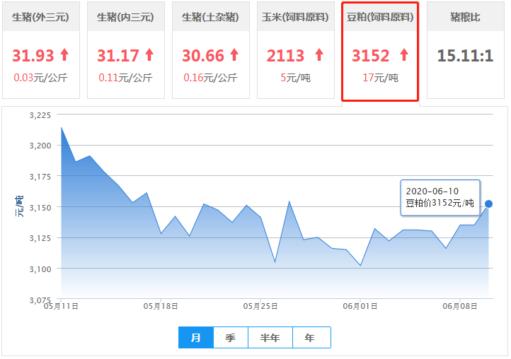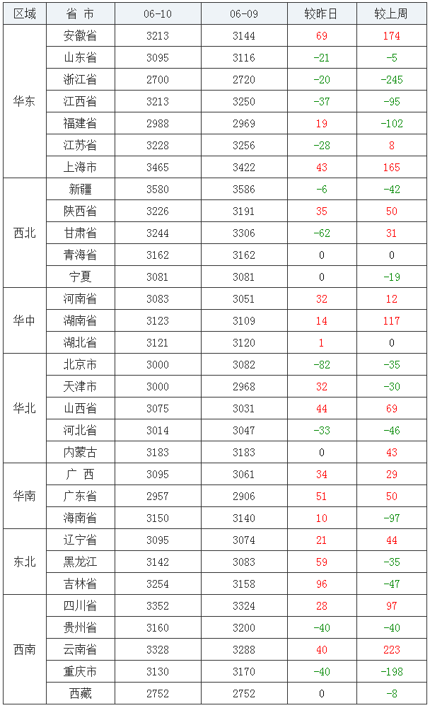 豆粕均价(饲料原料)前十:新疆维吾尔自治区3580元/吨、上海市3465元/吨、四川省3352元/吨、云南省3228元/吨、吉林省3254元/吨、甘肃省3244元/吨、江苏省3228元/吨、陕西省3226元/吨、江西省3213元/吨、安徽省3213元/吨;