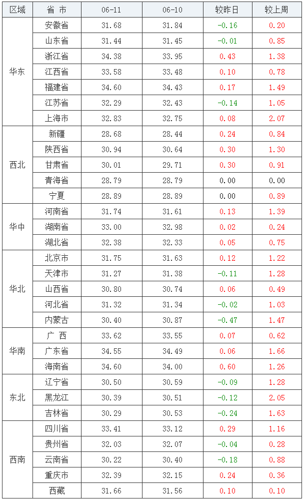 从“全国外三元均价涨跌表”来看,今日我国猪价下跌省份数量较昨日增加,但除了内蒙古猪价下跌了0.47元/公斤之外,整体跌势均较为平缓,对我国生猪均价走势没有太大影响。