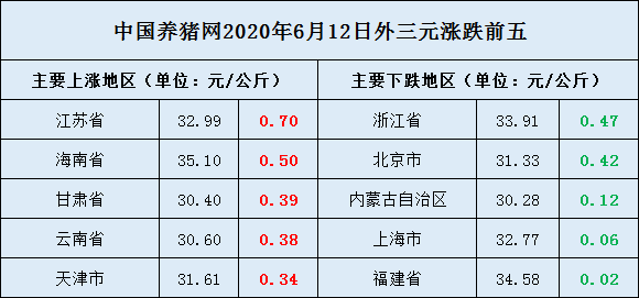 今日猪价上涨最高地区为:江苏省,外三元均价为32.99元/公斤,较昨日上涨了0.70元/公斤。