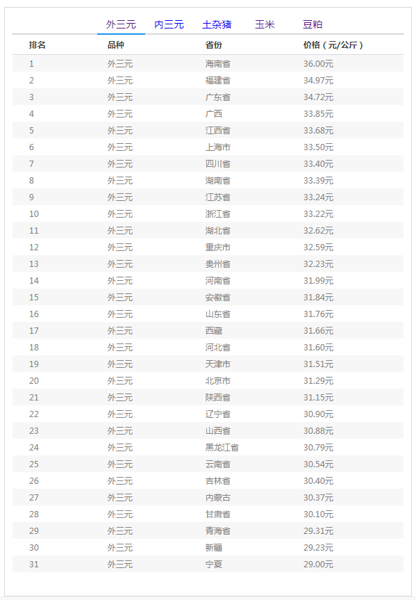 活猪价格排名前五的地区:海南省、福建省、广东省、广西壮族自治区、江西省。