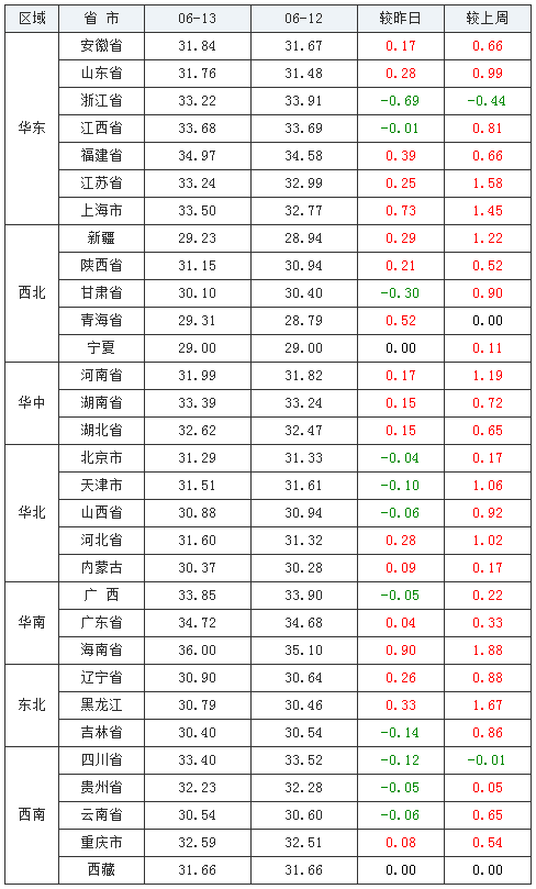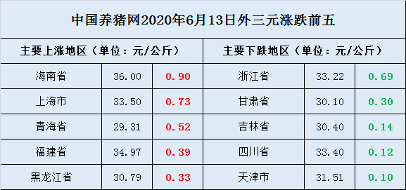 从“全国外三元均价涨跌表”来看,猪价呈现涨中有跌,跌中有涨的态势!西南地区与华北地区出现一波明显的下跌行情,猪价弱势震荡,其他地区明显看涨,且后续持续概率较大!