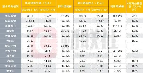 在仍有较大利润空间的情况下,猪企出栏量直接决定利润水平。数据显示,2020年1至4月,12家上市猪企10家销量下滑,但所有上市猪企的销售收入全部上涨,其中牧原股份生猪销量最高,为381.1万头,但温氏股份收入最高,为135.82亿元。