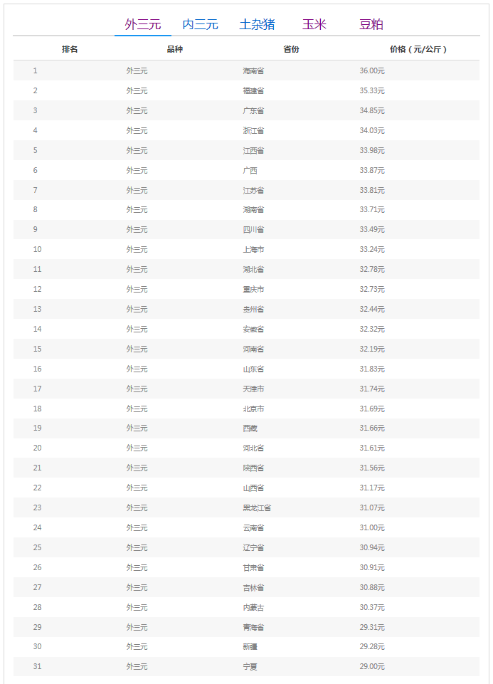 活猪价格排名前五的地区:海南省、福建省、广东省、浙江省、江西省。