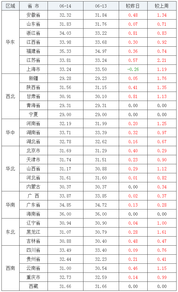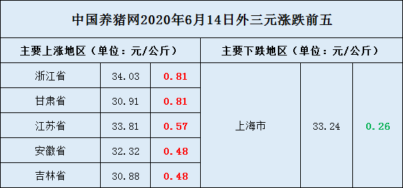 从“全国外三元均价涨跌表”来看,今日我国华东地区整体猪价涨势较其他6个区域更加明显。整体来看,除了上海市猪价下跌,山东省猪价涨势平缓之外,其余5省猪价最小涨势为0.30元/公斤,最大为0.81元/公斤!