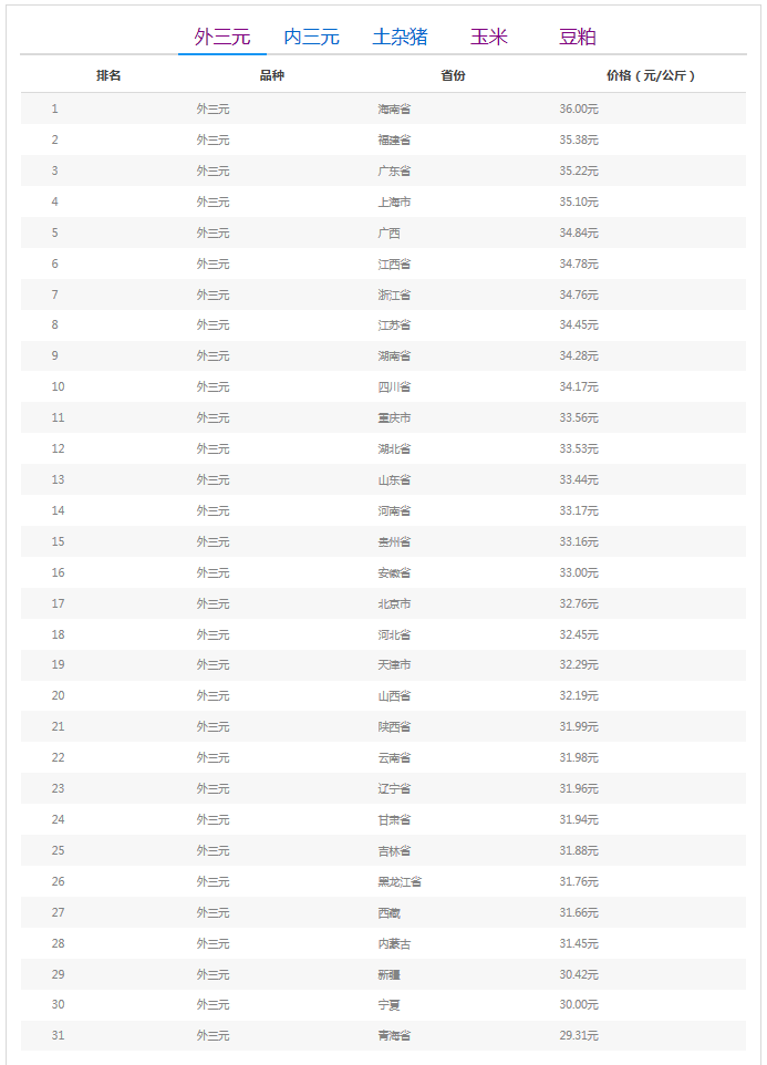 活猪价格排名前五的地区:海南省、福建省、广东省、上海市、广西壮族自治区。
