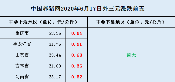 今日我国各地猪价暂无猪价下跌省份,猪价持平省份数量有5个,分别分布在华东、西北、华南以及西南地区,也就是说东北、华北以及华中3大地区今日猪价全面上涨!从“全国外三元猪价涨跌表”来看,我国各地猪价涨势较为“理性”,除了重庆与黑龙江两省,其余上涨省份的涨势最大到最小之间阶层分布均较为平均!