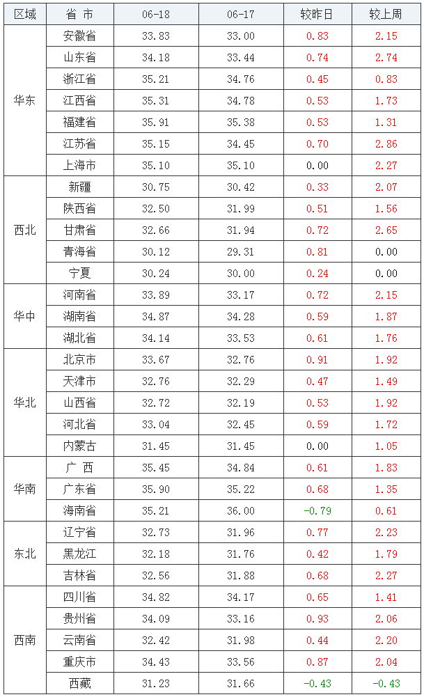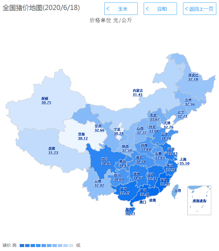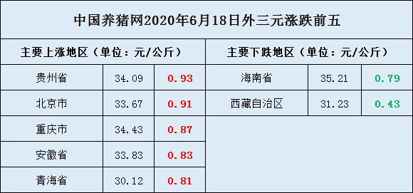 从“全国猪价排行榜”来看,今日我国猪价榜首换成福建省,目前价格为35.91元/公斤,福建猪价较昨日有所上涨,但最高猪价较昨日下跌了0.09元/公斤(昨日最高猪价——海南省猪价为36.00元/公斤)。今日海南猪价昨日下跌明显,0.79元/公斤的跌势直接让海南排名跌出全国前五!