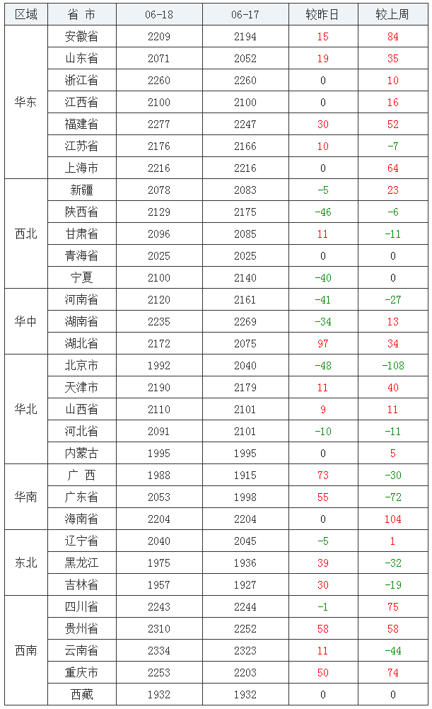 玉米均价(饲料原料)后十:西藏自治区1932元/吨、吉林省1957元/吨、黑龙江省1975元/吨、广西壮族自治区1988元/吨、北京市1992元/吨、内蒙古自治区1995元/吨、青海省2025元/吨、辽宁省2040元/吨、广东省2053元/吨、山东省2071元/吨。