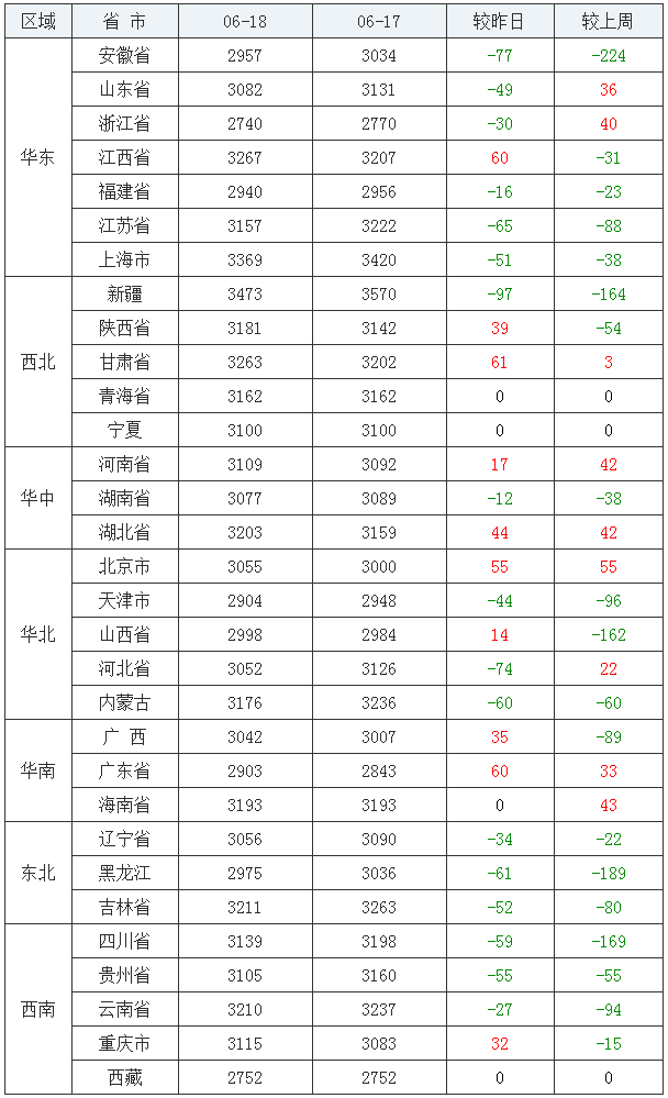 豆粕均价(饲料原料)后十:浙江省2740元/吨、西藏自治区2752元/吨、广东省2903元/吨、天津市2904元/吨、福建省2940元/吨、安徽省2957元/吨、黑龙江省2975元/吨、山西省2998元/吨、广西壮族自治区3042元/吨、河北省3052元/吨。