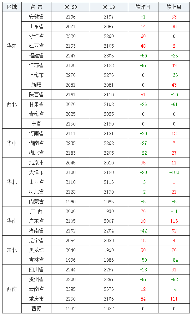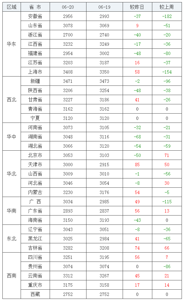 豆粕均价(饲料原料)后十:浙江省2700元/吨、西藏自治区2752元/吨、广东省2893元/吨、福建省2954元/吨、安徽省2956元/吨、天津市3000元/吨、山西省3009元/吨、黑龙江省3025元/吨、广西壮族自治区3034元/吨、辽宁省3043元/吨。