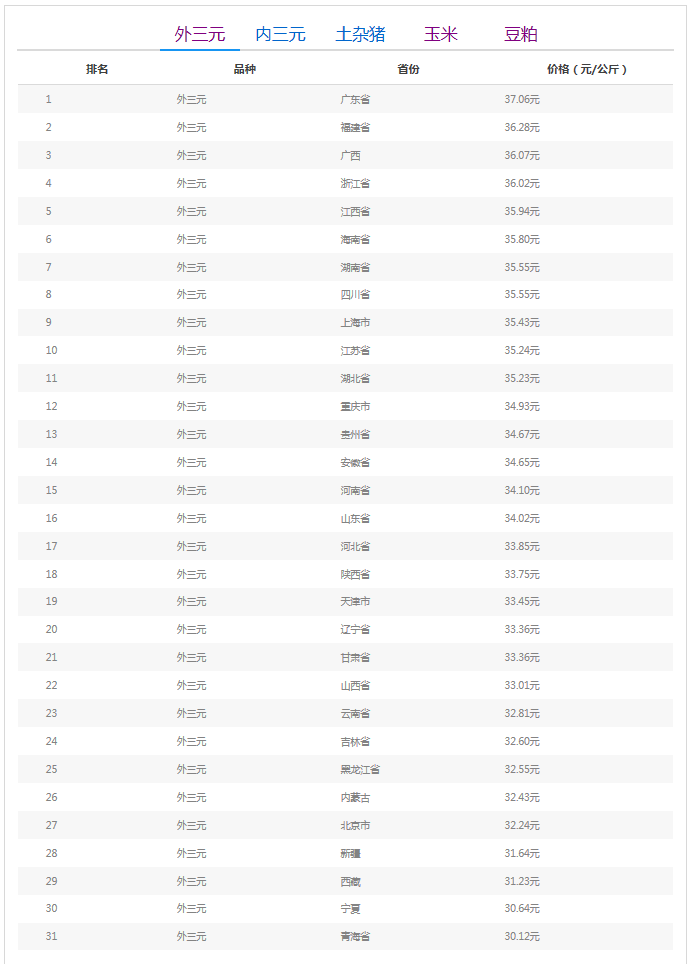 活猪价格排名前五的地区:广东省、福建省、广西壮族自治区、浙江省、江西省。