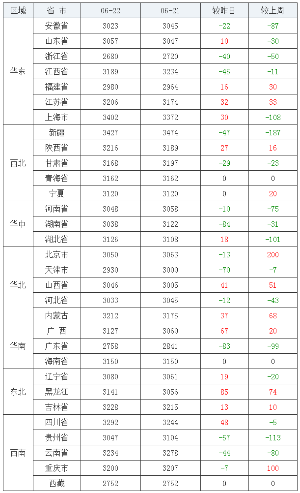 豆粕均价(饲料原料)后十:浙江省2680元/吨、西藏自治区2752元/吨、广东省2758元/吨、天津市2930元/吨、福建省2980元/吨、安徽省3023元/吨、河北省3033元/吨、湖南省3038元/吨、山西省3046元/吨、贵州省3047元/吨。