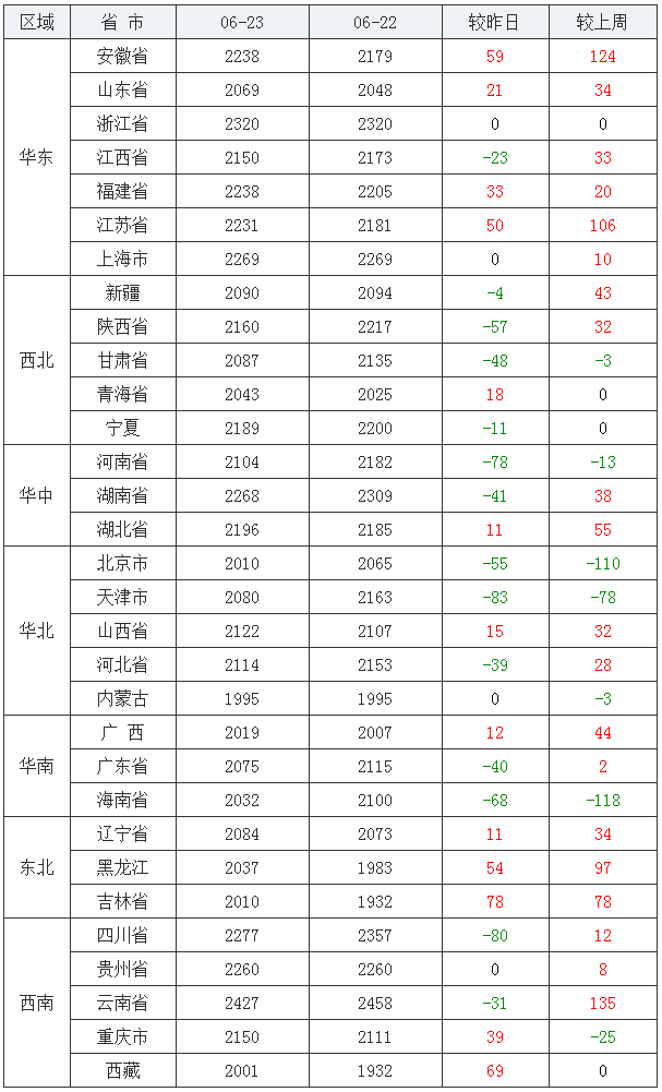 玉米均价(饲料原料)前十:云南省2427元/吨、浙江省2320元/吨、四川省2277元/吨、上海市2269元/吨、湖南省2268元/吨、贵州省2260元/吨、福建省2238元/吨、安徽省2238元/吨、江苏省2231元/吨、湖北省2196元/吨;