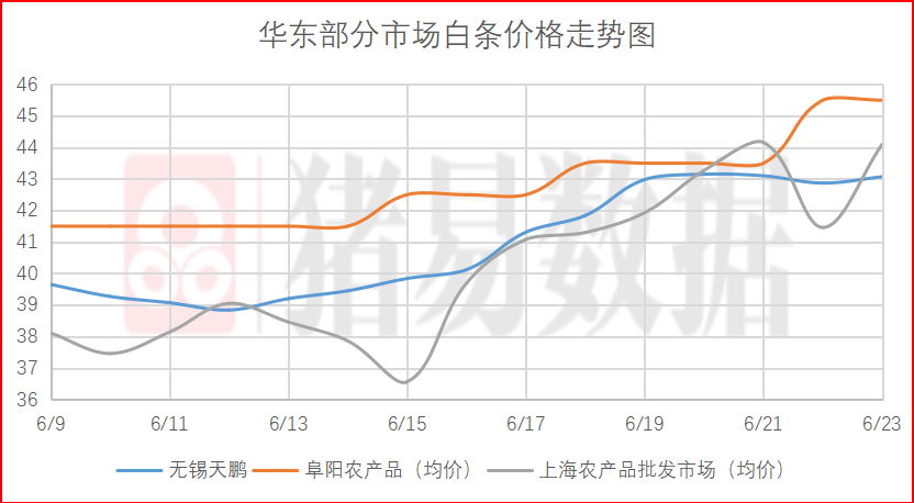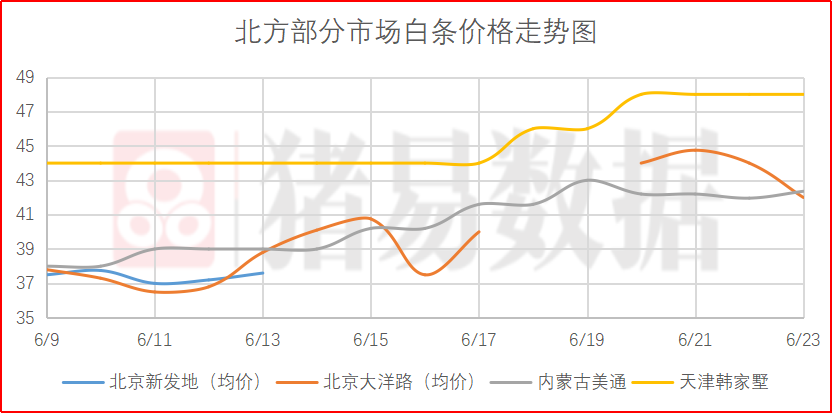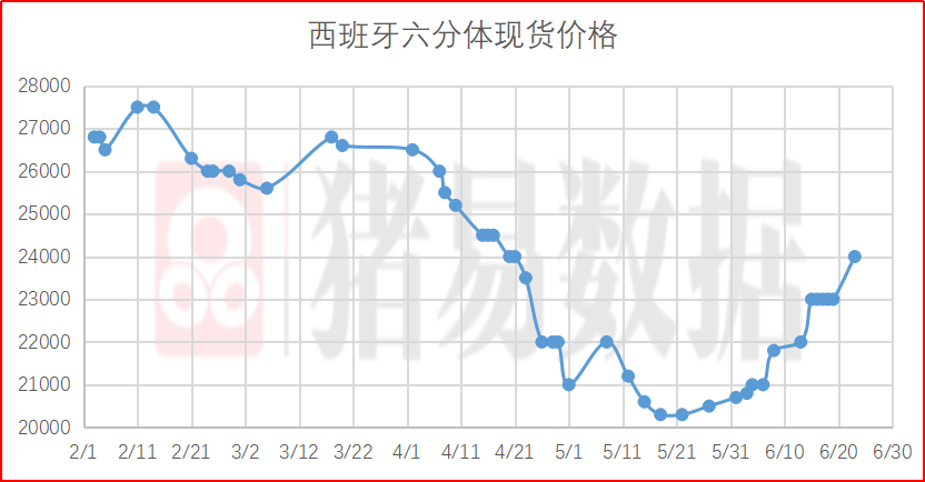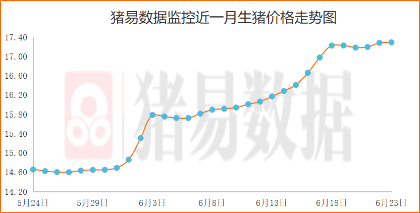 据数据显示,2020年6月23日全国标准体重生猪平均价格为34.58元/公斤,较昨日价格上涨0.02元/公斤,涨幅为0.06%;较19年同期17.27元/公斤上涨17.31元/公斤,涨幅为100.23%;