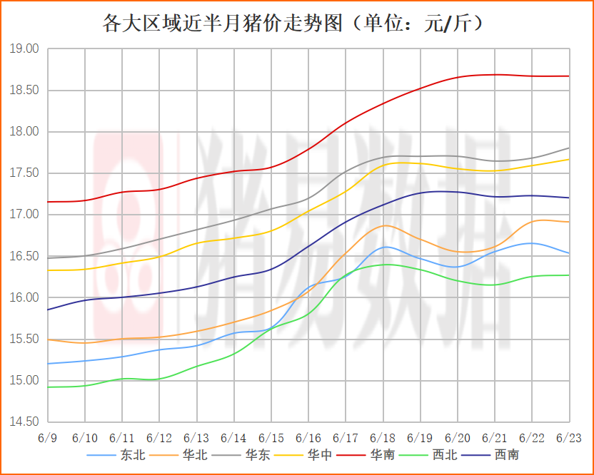 华东、华中、西北地区猪价微幅上涨,东北、西南地区猪价微幅下跌,湖北、华南地区猪价以稳定为主,整体猪价微幅上升。