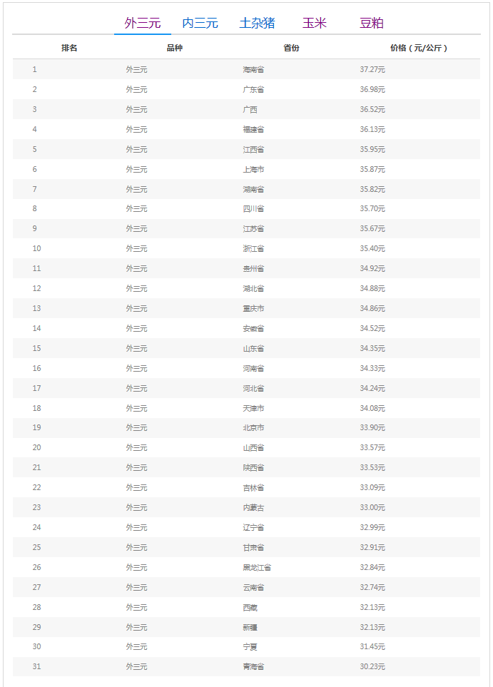 从“全国猪价排行榜”来看,今日我国猪价榜首“换人”,海南省以37.27元/公斤的价格一举夺魁!曾蝉联数日的广东猪价,今日暂居第2。昨日广东猪价为36.91元/公斤,海南猪价为36.70元/公斤,两省之间相差0.21元/公斤,但今日海南猪价上涨了0.57元/公斤,广东猪价上涨了0.07元/公斤,海南猪价涨势远远甩开广东猪价!