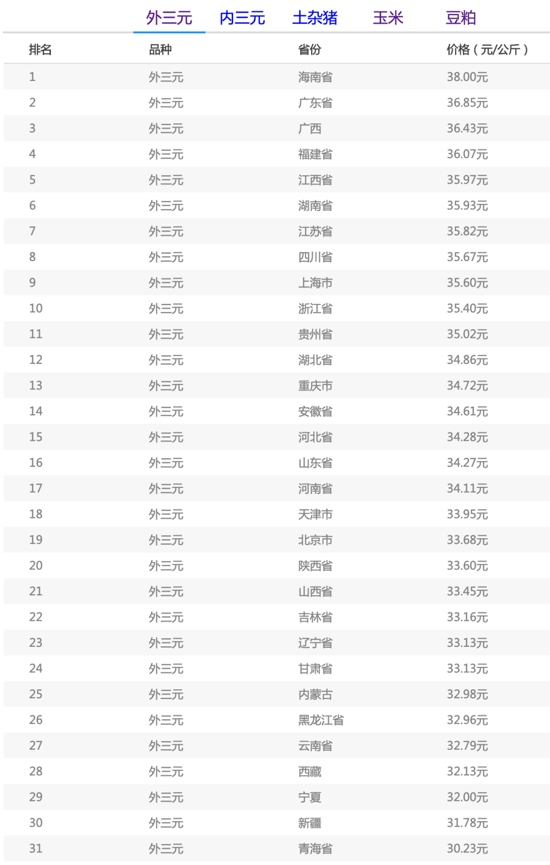活猪价格排名前五的地区:海南省、广东省、广西壮族自治区、福建省、江西省。