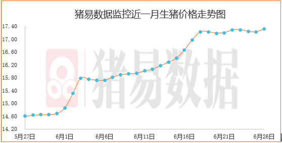 据数据显示,2020年6月26日全国标准体重生猪平均价格为34.62元/公斤,较昨日价格上涨0.17元/公斤,张幅为0.49%;较19年同期17.14元/公斤上涨17.48元/公斤,涨幅为101.98%;