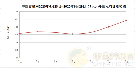 从“中国养猪网2020年06月23日-6月29日(7天)外三元均价走势图”来看,猪价在近两日开始一路走高,行情较为喜人。