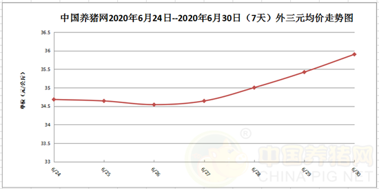 从“中国养猪网2020年06月24日-6月30日(7天)外三元均价走势图”来看,猪价再次高升仰头上涨,但要警惕近几天猪价上涨较快,要卖猪的朋友们应抓住这波红利机会适时出栏。