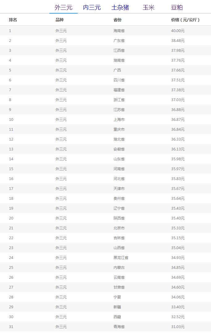 活猪价格排名前五的地区:海南省、广东省、江西省、湖南省、广西壮族自治区。