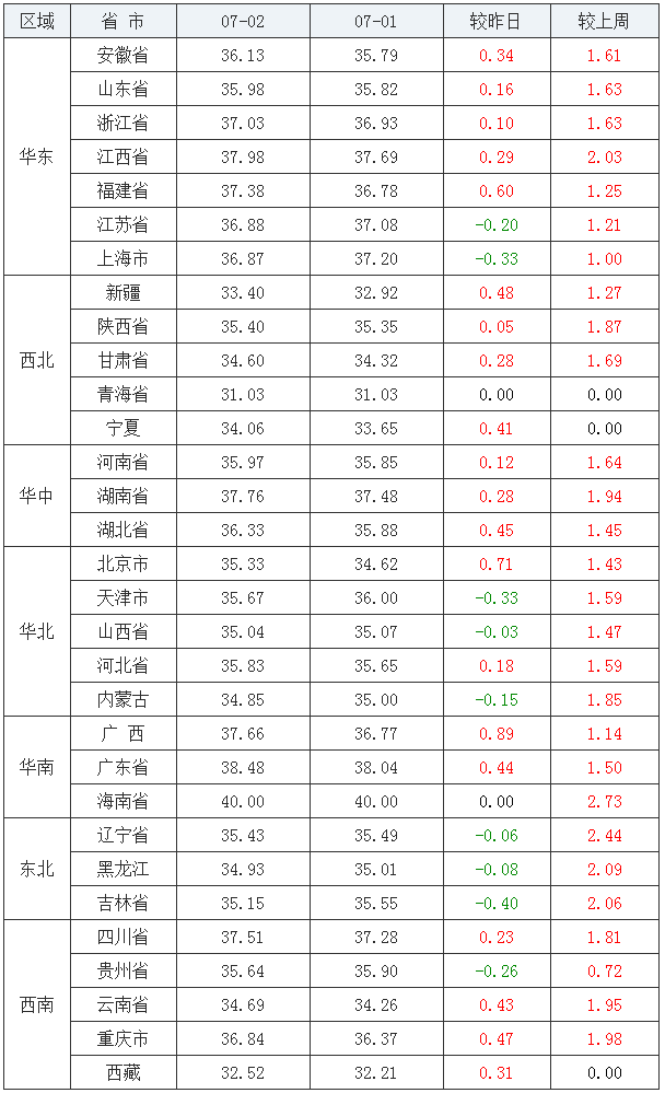 从“全国猪价排行榜”来看,榜首海南省保持着昨日的均价,今日行情相对平稳。紧随其后的广东省正在加大火力猛烈追击,其猪价日渐增长,努力向39元/公斤迈去。排名前十的省份猪价均在36-37元/公斤之间,其中在36元价位的省份有上海、江苏省,其余省份均价在37元/公斤。