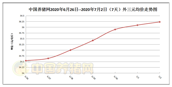 从“中国养猪网2020年06月26日-7月2日(7天)外三元均价走势图”来看,今日我国外三元生猪价格继续走高,涨势较前段时间有一定程度的放缓,但行情依旧利好!