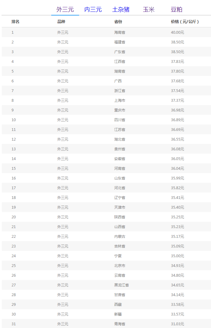 从“全国猪价排行榜”来看,前几名几乎无太大变化,今日福建省发力,已追上广东省猪价,排名与之持平。