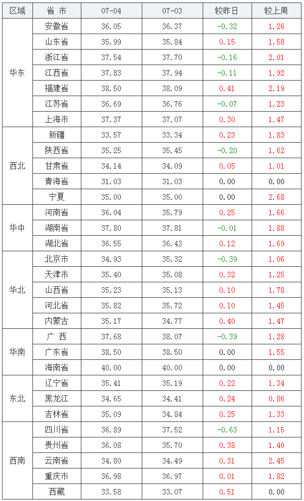 由上表可以看出,下跌地区依旧较多,但较昨日相当,局地以持平态势运行。纵观来看,均价仅有小幅上调,多以低价区补涨为主,北方在经历昨天一天的下跌后今日开始有小范围回升;而南方局地出现小幅下跌态势。预计近期局地猪价仍有小涨可能,但多以横盘为主。