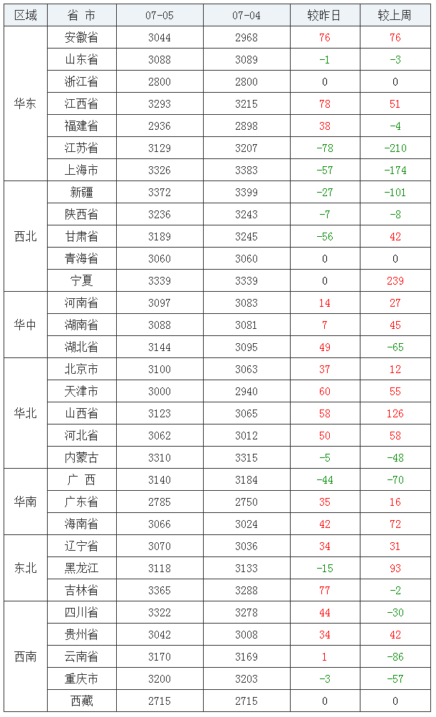 豆粕均价(饲料原料)后十:西藏自治区2715元/吨、广东省2785元/吨、浙江省2800元/吨、福建省2936元/吨、天津市3000元/吨、贵州省3042元/吨、安徽省3044元/吨、青海省3060元/吨、河北省3062元/吨海南省3066元/吨。