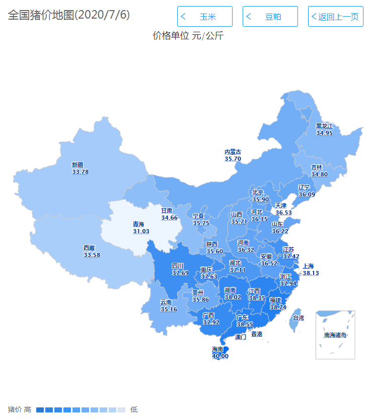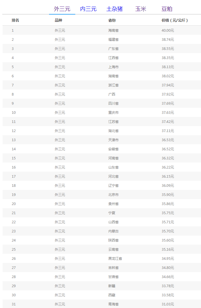 活猪价格排名前五的地区:海南省、福建省、广东省、江西省、上海市。