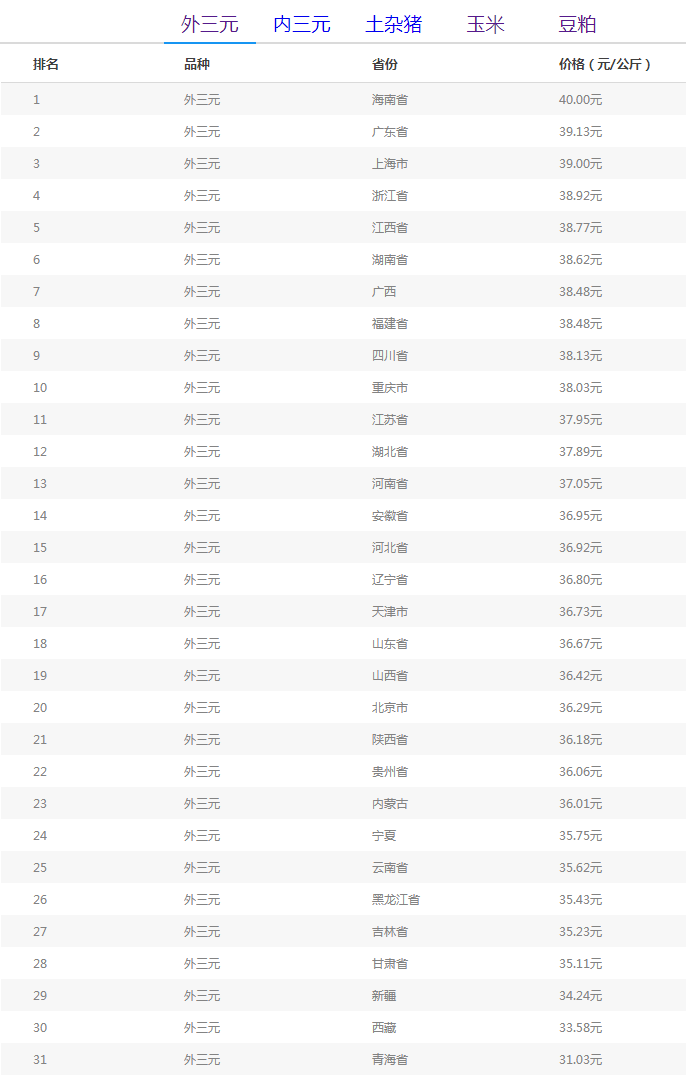 从“全国外三元均价排行榜”来看,各省份排序依旧是“老选手”在位,不过值得注意的是,海南省的40元价位已保持一段时间且几乎未变,然而广东省、上海市生猪均价已达39元/公斤左右,这样下去是否会被“超车”?