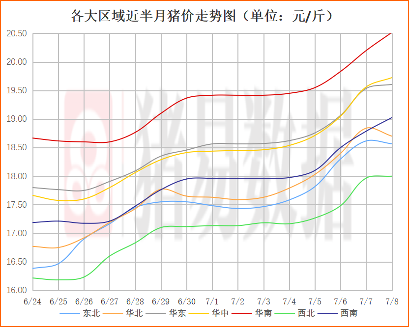 西北、华东、华中、湖南、西南地区猪价上涨,东北、华北地区猪价有着一定的下跌现象,整体猪价涨势放缓。