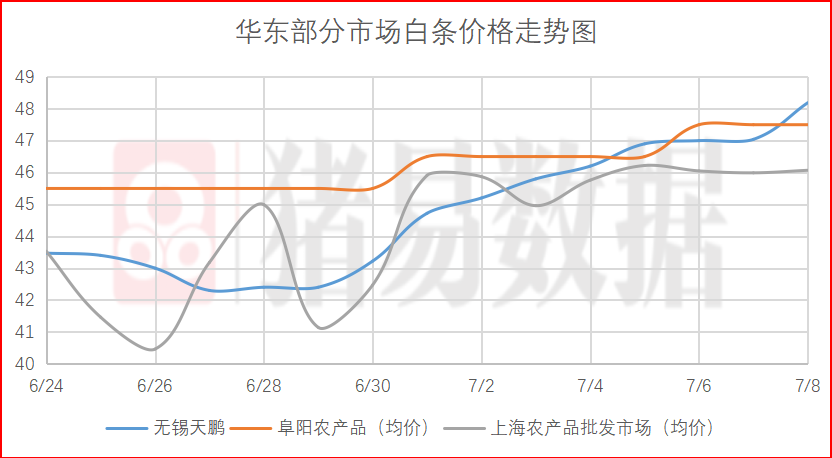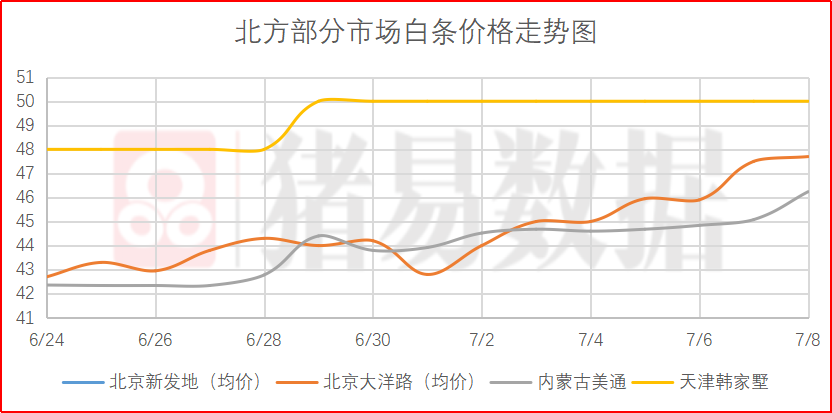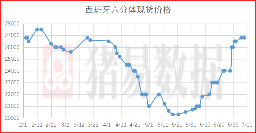 据监测数据显示,2020年7月08日全国标准体重生猪平均价格为38.33元/公斤,较昨日价格上涨0.18元/公斤,涨幅为0.47%;较19年同期17.47元/公斤上涨20.86元/公斤,涨幅为119.40%;