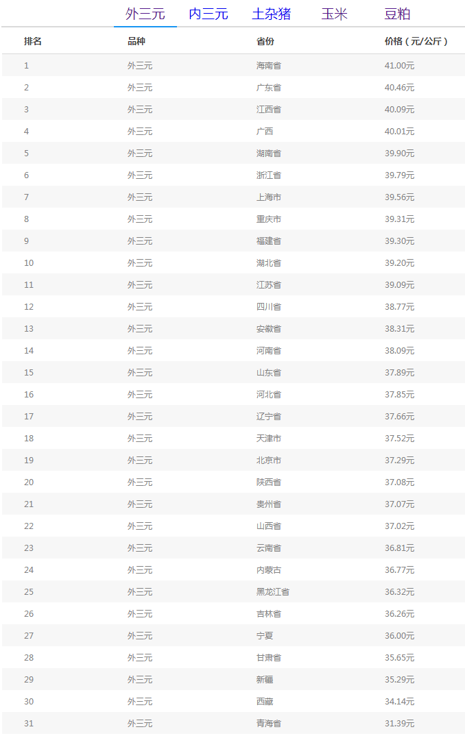 从“全国外三元均价排行榜”来看,海南省似乎是感觉到近期的压力“逼迫”,今日发力大涨1元/公斤,其均价达到41.00元/公斤。广东省、江西省、广西壮族自治区在今日统一上40元/公斤,紧随其后的湖南省、浙江省、上海市、重庆市、福建省、湖北省、江苏省均已达39元/公斤,这是继年初受疫情影响猪价走高的再一次的高峰,当然,这个数值或许还将增加。